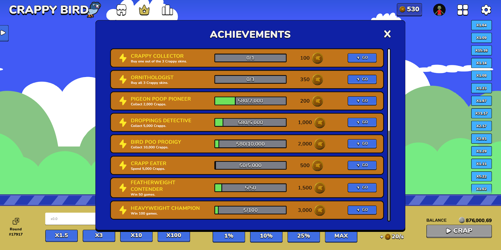 <figure><img src="https://1354689930-files.gitbook.io/~/files/v0/b/gitbook-x-prod.appspot.com/o/spaces%2F6kI4RTfAPnTBa03EgpRM%2Fuploads%2F6zfBNHofgU4vbCHJbibt%2Fimage.png?alt=media&#x26;token=378150a2-e1d2-416b-bd96-510cbd7cf676" alt=""><figcaption><p>Collect CRAPPS by unlocking achievements</p></figcaption></figure>