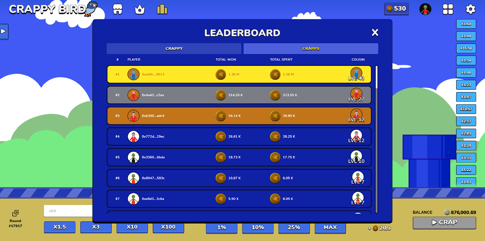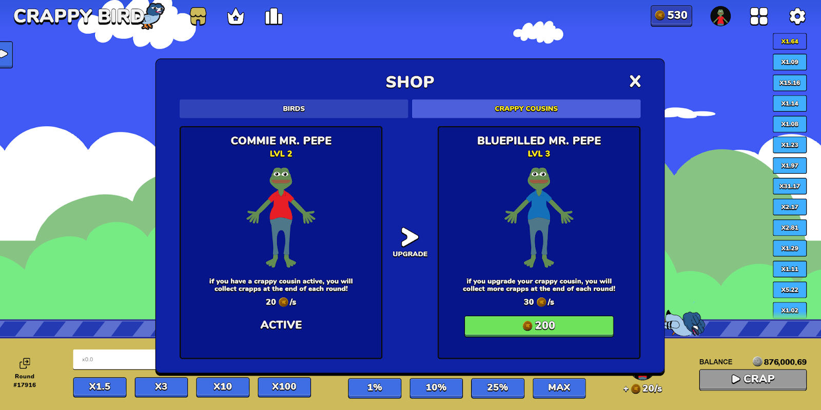 > If you’ve been paying attention, when Crappy flies you can see there are CRAPPS falling down from the sky, which after you’ve played 10 games will be collected by your level 1 cousin, Mr. Pepe.